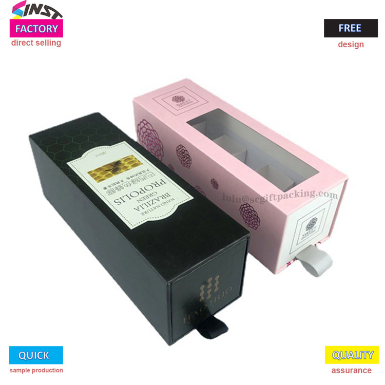 این بسته بندی جعبه هدیه کشویی سفت و سخت کشویی لوکس برای روغن ضروری دارای یک طراحی محفظه و پنجره های شفاف است که امکان دید واضح از چهار محفظه داخل جعبه را بدون نیاز به باز کردن درب فراهم می کند. هنگامی که جعبه های دوتایی سیاه و صورتی در کنار هم قرار می گیرند ، نبوغ طراحی را می توان مشاهده کرد: جعبه سیاه دارای حروف طلایی است که برای ظاهری بافت تر روی بدن تزئین شده است و حلقه کشش سیاه در طرف می تواند به راحتی باز شود. مدل صورتی یک پنجره شفاف را حفظ می کند ، که می تواند به طور مستقیم مخزن ویژه برای نمونه Essence را مشاهده کند - آزمایش لوسیون ، جوهر 10 میلی لیتر پیچیده شده. از نمونه های ذات گرفته تا ابزارها ، تقسیم واضح و بدون سیم است.