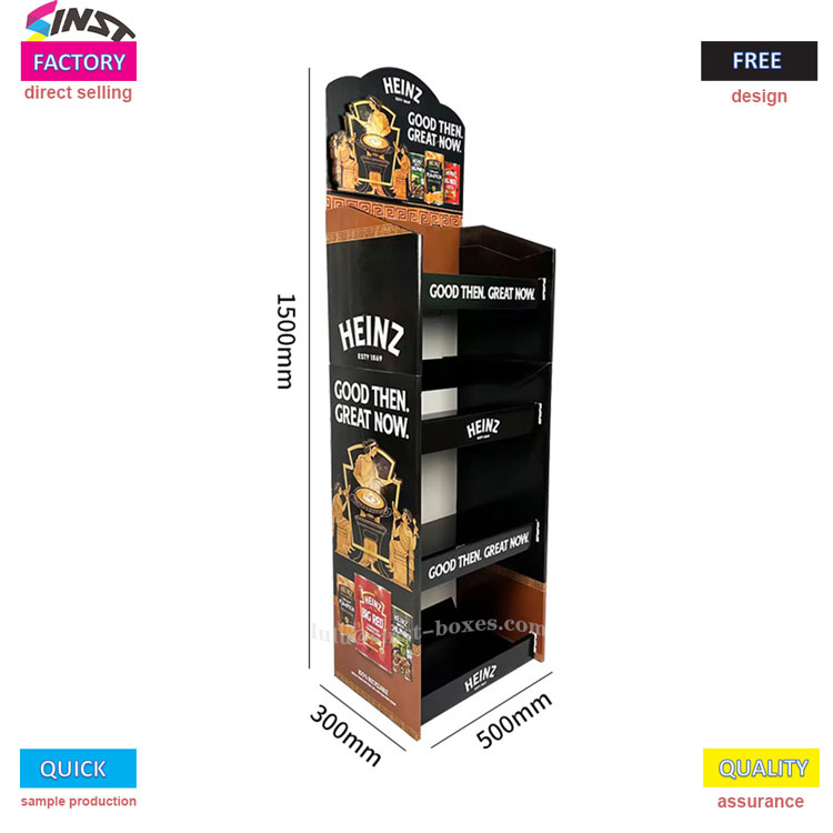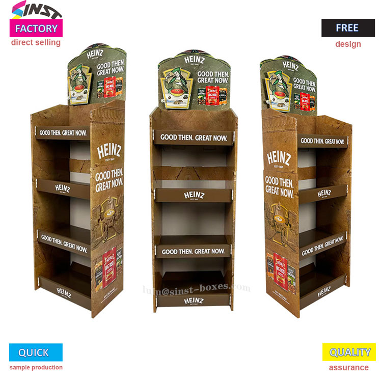 این پایه نمایشگر سس گوجه فرنگی در سه طرح قهوه ای، مشکی و قرمز عرضه می شود. ساختار باز چند لایه، با لوگوها و شعارهای برند چاپ شده در قفسه ها، کناره ها و بالا برای تقویت حافظه برند. اندازه شفاف، مناسب برای نمایش سوپرمارکت. جلب توجه موثر ابزاری چشم نواز برای نمایش سس است.